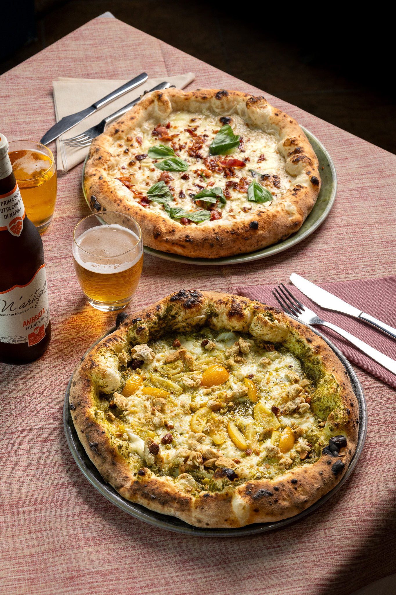 pancetta, zucchine fritte, emmenthal, mozzarella di bufala, pepe nero, olio Evo, basilico