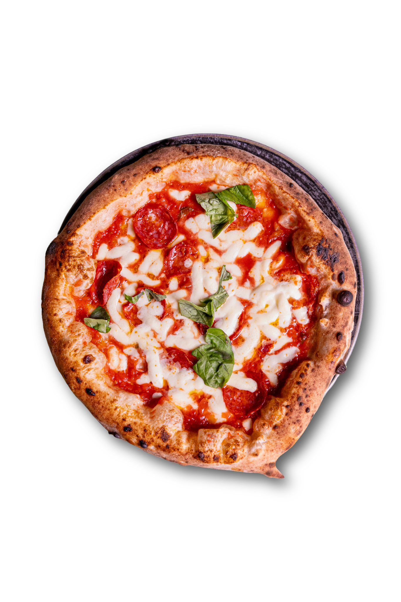 pomodoro, fior di latte, salamino piccante, olio Evo, basilico